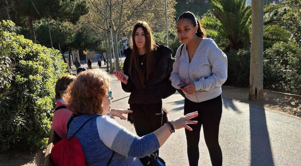 Som els alumnes de l’Institut Escola Mirades: Alejandra Salgado, Laura Mercader, Nicolás Cardona i Lucian Seicarin. Estem elaborant un treball de recerca sobre els espais verds i els parcs del nostre barri, el Carmel. Aquesta investigació forma part d’un projecte d’eines de llengua, amb l’objectiu de fer un petit reportatge i obtenir respostes sobre qüestions que preocupen el veïnat. El dilluns 31 de març vam visitar el Parc de les Palmeres, al barri del Carmel, a les 9 del matí.